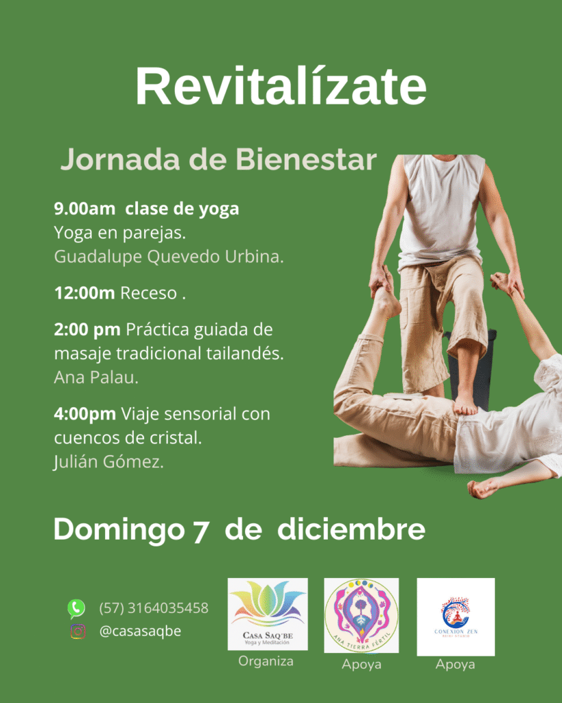 Yoga en parejas, masaje tradicional tailandés (práctica guiada) y armonización con cuencos de cristal. Te invitamos a nuestra jordana de bienestar revitalízate, regálate este espacio para el cuerpo, la mente y el corazón. Será un día para disfrutar el fluir natural de la energía vital en alegría y contento.